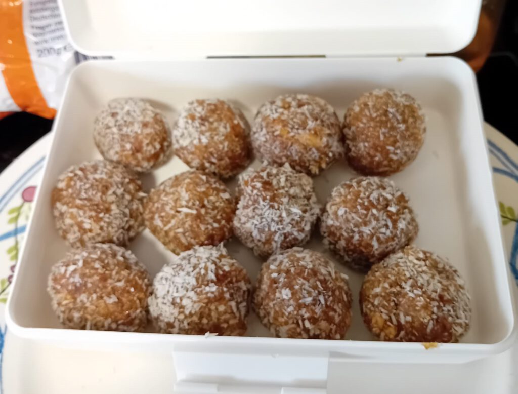 Ich kaufe für dich ein und bereite gesunde vollwertige Mahlzeiten und Snacks zu, damit dein Körper mit Energie und Nährstoffen versorgt ist. Auf dem Foto siehst du Energiekugeln.